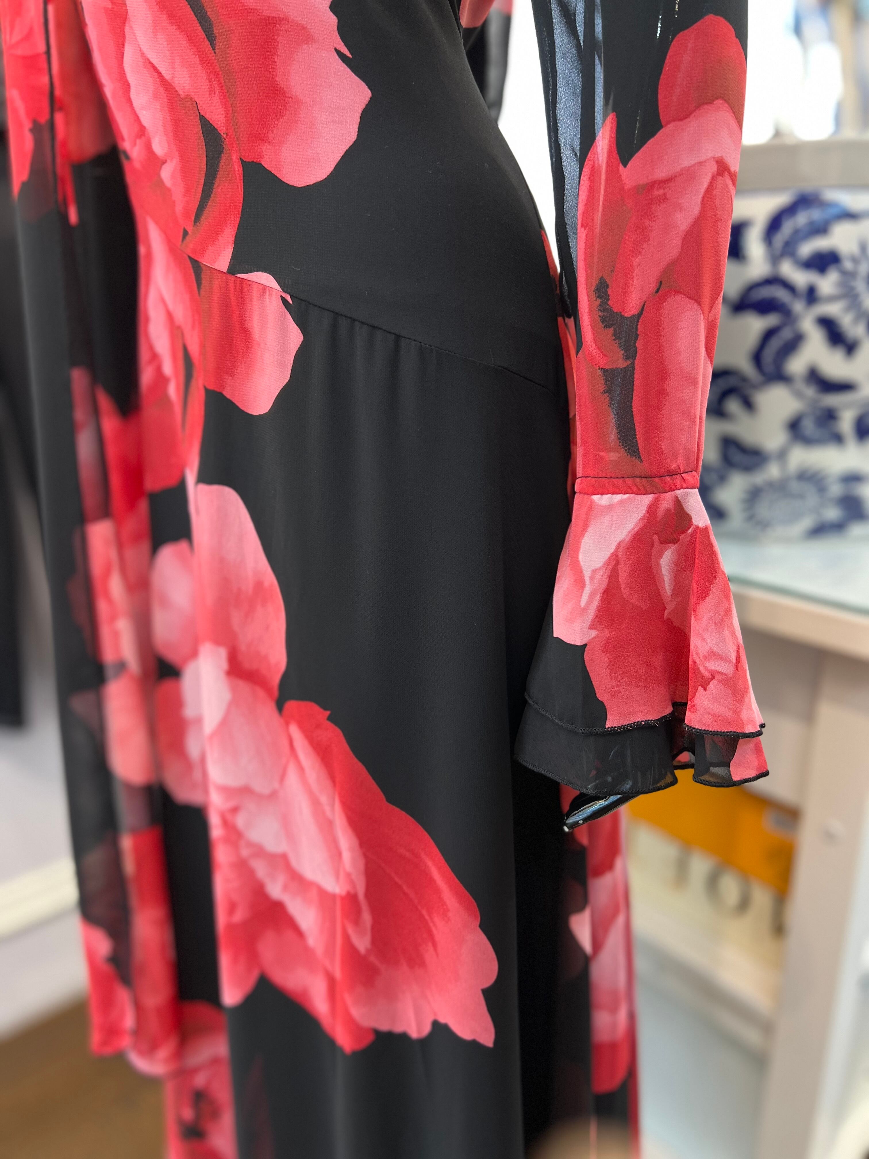 フレアスリーブ花柄ポリエステルシフォンドレス